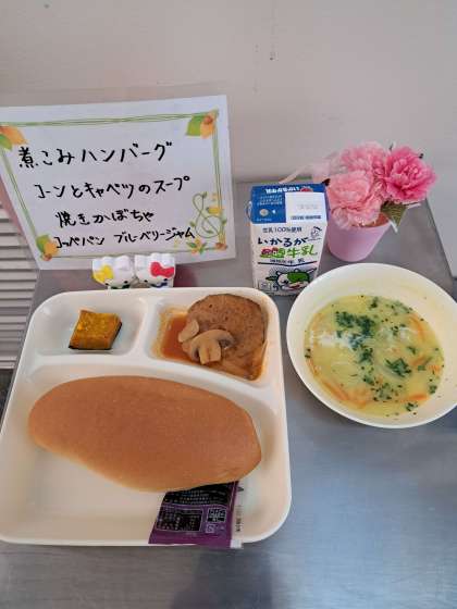 煮込みハンバーグ、コーンとキャベツのスープ、焼きかぼちゃ