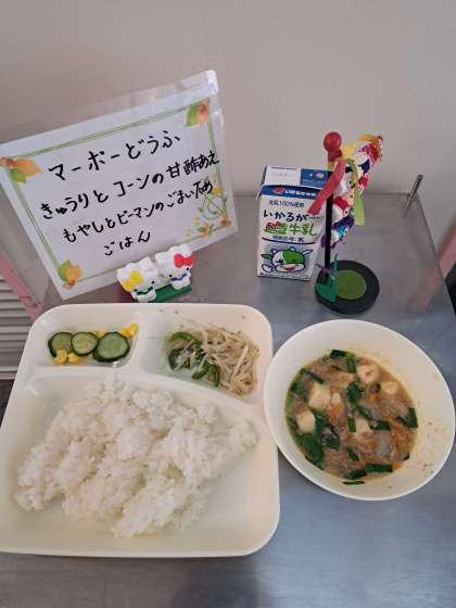 マーボーどうふ、きゅうりとコーンの甘酢あえ、もやしとピーマンのごまいため