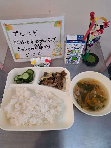 プルコギ、とうふとわかめのスープ、きゅうりの甘酢づけ