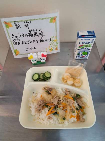 豚丼、きゅうりの梅風味、白玉だんごのきな粉がけ