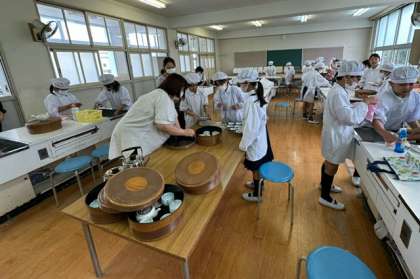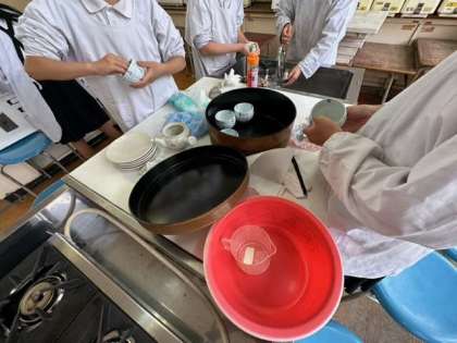 5年生の家庭科「お茶を入れよう」では、グループで役割分担して実習することができました。