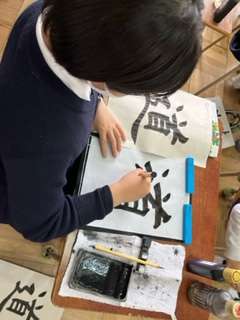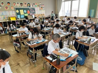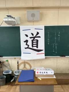 先週から今週にかけて毛筆で「道」を書きました。久しぶりの毛筆ということもあり、みんな緊張した面持ちで見本を見ながら丁寧に筆を運んでいました。一画一画、トメ、ハネ、ハライを気をつけながら書いていました。しっかり書けたかな?