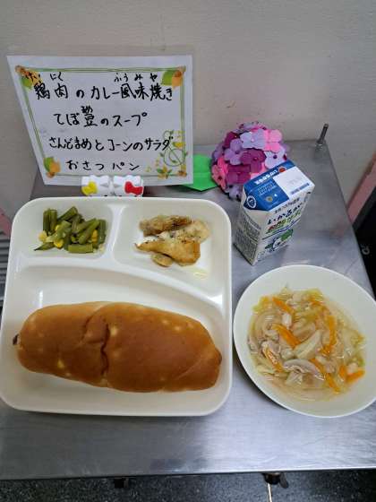 鶏肉のカレー風味焼き、てぼ豆のスープ、さんどまめとコーンのサラダ