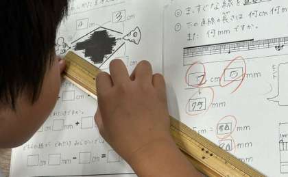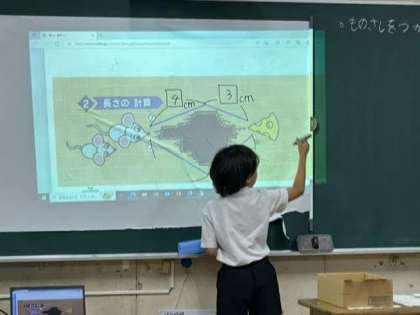 本時は、「長さのたんい」について、2つに分けて長さを測り、加減計算で答えを求める方法を考える時間です。
