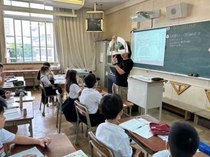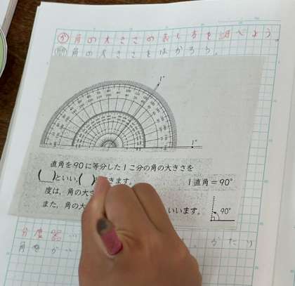 4年生では、少人数に分かれて各教室で「角の大きさの表し方」を調べています。