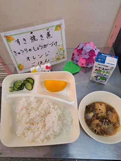すき焼き煮、きゅうりのしょうがづけ、オレンジ