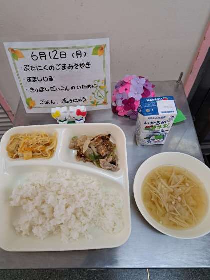 豚肉のごまみそ焼き、すまし汁、切干しだいこんのいため煮