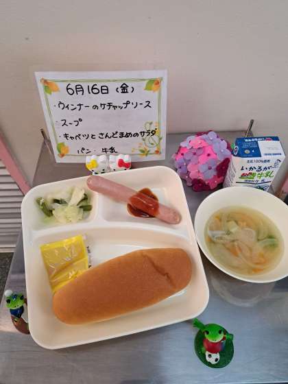 ウインナーのケチャップソース、スープ、キャベツとさんどまめのサラダ