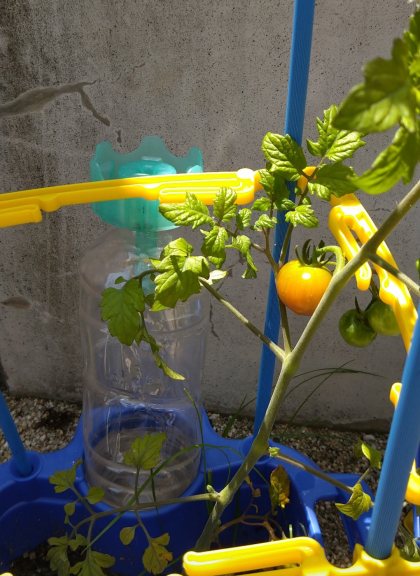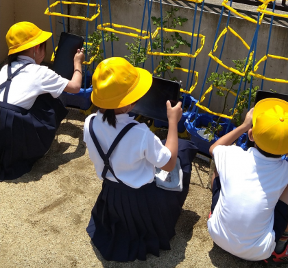 ミニトマトが育ってきました。タブレットを使って成長の度合いを確認しています。