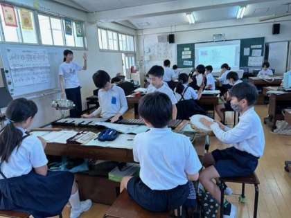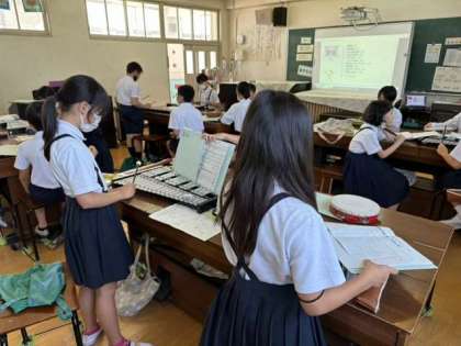 班のメンバーで、リコーダー・木琴・鉄琴・低音楽器・タンブリン・小太鼓に分かれて練習しています。
