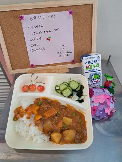 ハヤシライス、ミックス海そうのサラダ、さくらんぼ
