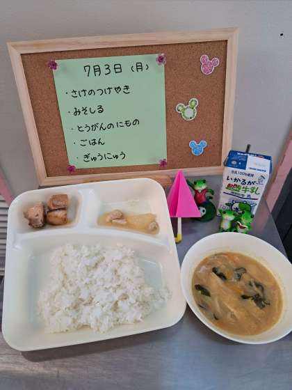 さけのつけ焼き、みそ汁、とうがんの煮もの