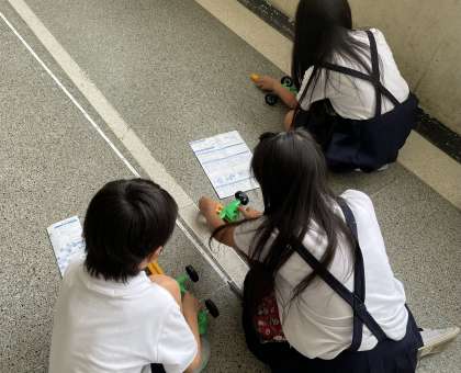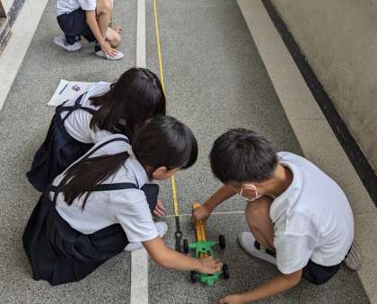 ゴムカーを作成し、ゴムの伸ばす長さで車の進む距離の変化を実験しました。