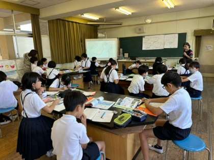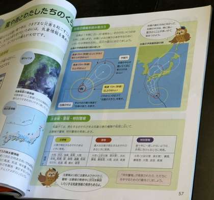 台風の動きと天気の変化について、雨が降っている地域に色をぬりながら確認しています。