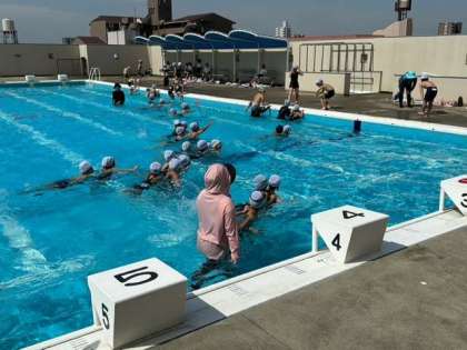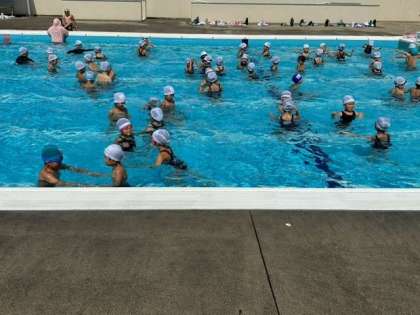 2人組で泳いだり、もぐって浮き上がったりしながら楽しんでいます。