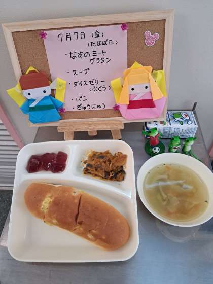 なすのミートグラタン、スープ、ダイスゼリー(ぶどう)