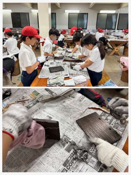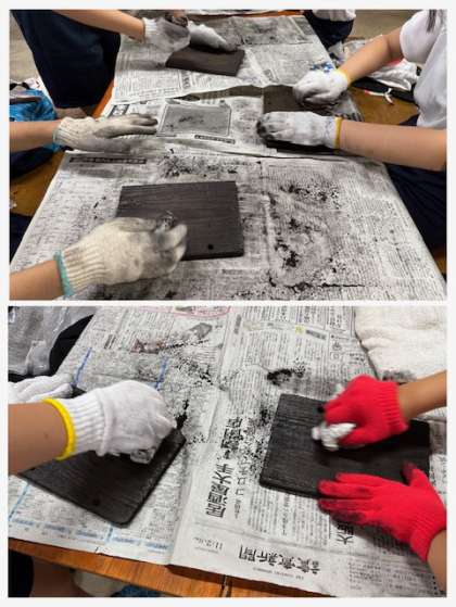 魚を焼いている間に、新聞紙を丸めて、焼き板をみがきました。