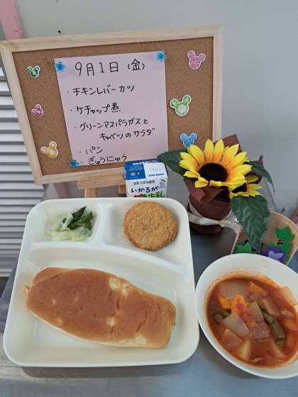 チキンレバーカツ、ケチャップ煮、グリーンアスパラガスとキャベツのサラダ