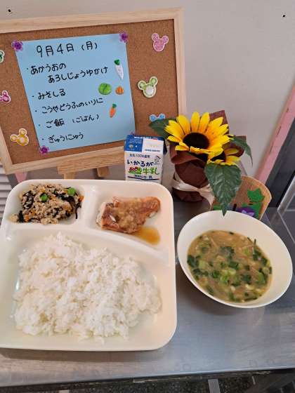 あかうおのおろしじょうゆかけ、みそ汁、高野どうふのいり煮