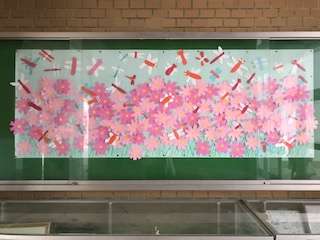 今月の学校掲示板は4年生が作ったコスモスとトンボでいっぱいです。