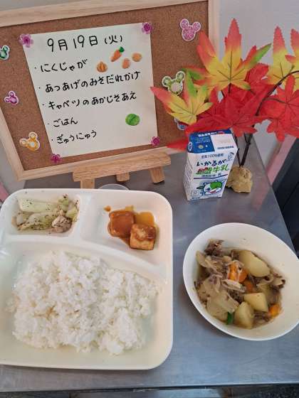肉じゃが、あつあげのみぞれかけ、キャベツの赤じそあえ