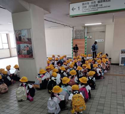 学校を出発して、今川駅でかしこく電車を待っています。