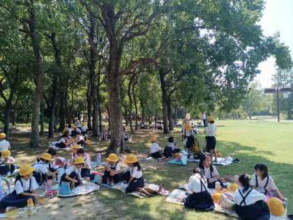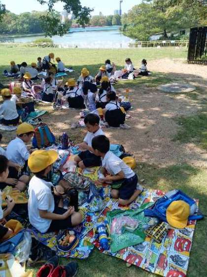 とてもよいお天気で、歩くことに少し疲れた児童もいますが、皆でお弁当を広げています。