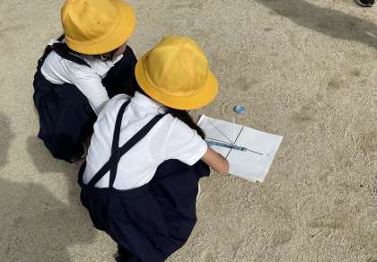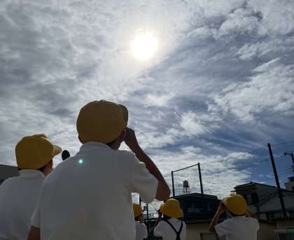 かげと太陽の学習では、太陽の光(日光)とかげの関係について調べています。遮光版を使って太陽を観察し、ストローを用いた記録用紙で時間毎のかげの動きなどを調べます。