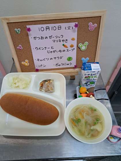 かつおのガーリックマリネ焼き(ノンエッグドレッシング)、ウインナーとじゃがいものスープ、キャベツのサラダ