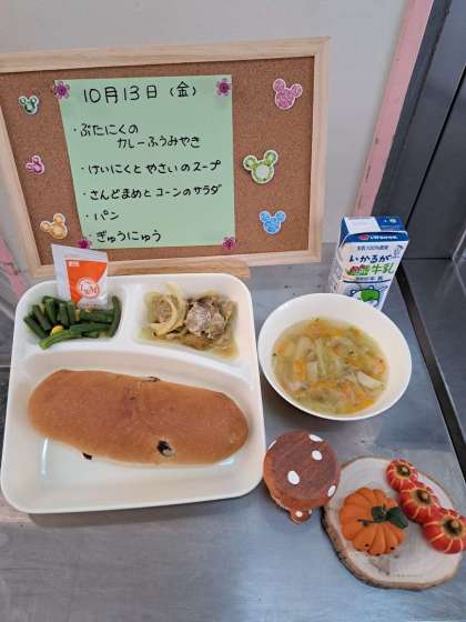 豚肉のカレー風味焼き、鶏肉と野菜のスープ、さんどまめとコーンのサラダ(ノンエッグドレッシング)