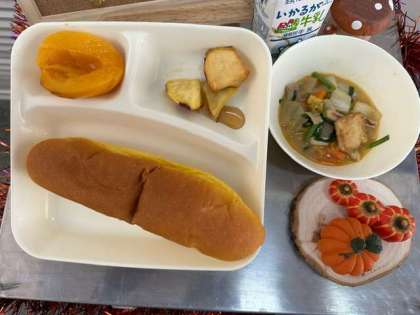 豚肉といかの中華煮・だいがくいも・黄桃(かんづめ)