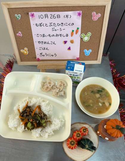 もずくと豚ひき肉のジューシー・さつまいものみそ汁・焼きれんこん
