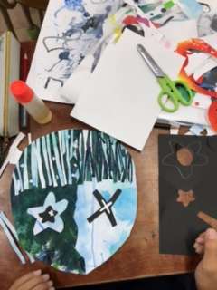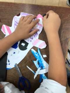 様々な技法で描いた画用紙を使ってピエロを作っています。目や鼻、口をどんな表情にするか考えたり、帽子や髪の毛、手の形を工夫したりして切っています。とても楽しそうに作っています。