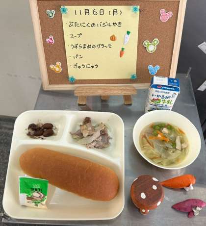豚肉のバジル焼き・スープ・うずら豆のグラッセ