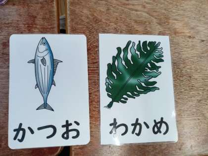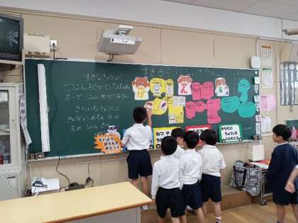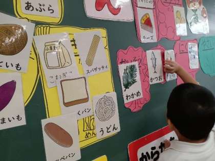食材カードを仲間分けしたり、今日の給食の献立が何色になるか考えたりしました。