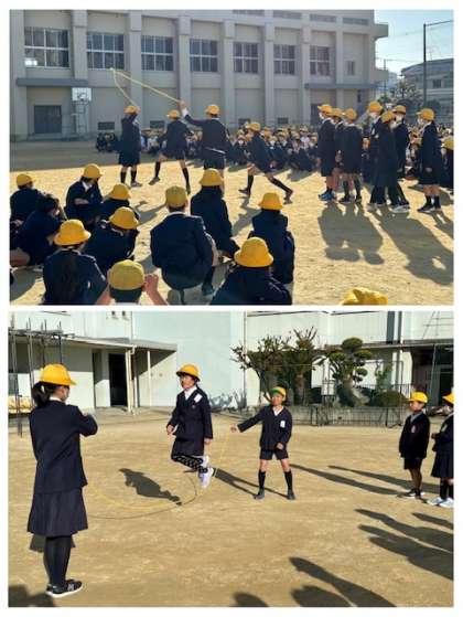 高学年が、跳ぶ人のようすを見て、大きく回したり、地面をはわしたりしながら、跳びやすいように工夫してくれていました。