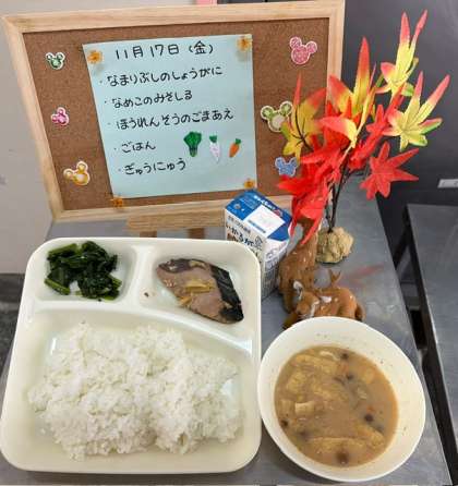 なまり節の生姜煮・なめこの味噌汁・ほうれん草のごまあえ・ごはん・牛乳