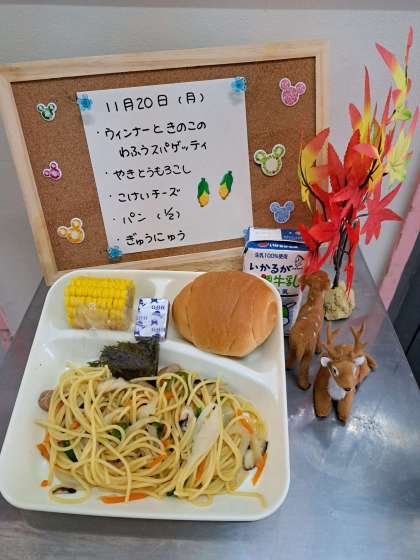 ウインナーときのこの和風スパゲッティ、焼きとうもろこし、固形チーズ