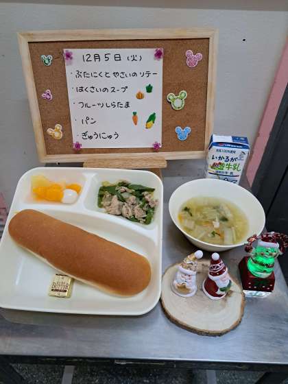 豚肉と野菜のソテー、はくさいのスープ、フルーツ白玉