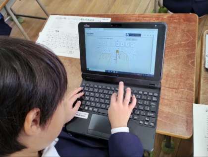 今日はICTの支援員の方に来ていただき、タイピングを両手でする練習をしました。