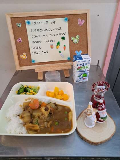 冬野菜のカレーライス、ブロッコリーとコーンのサラダ、黄桃(カット缶)