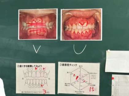 歯・口の健康チェックシートを使って、歯ぐき、歯垢、歯みがき回数、おやつの食べ方、かむ回数、好き嫌いについて、自分でチェックしました。