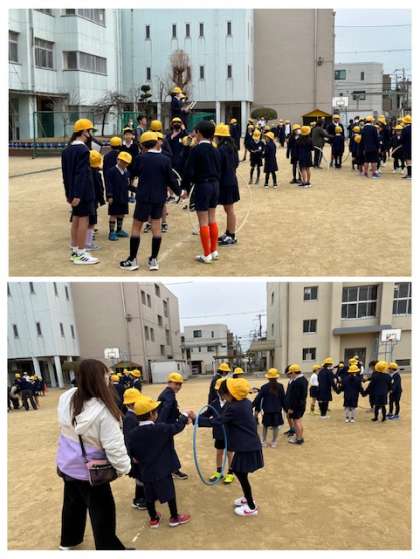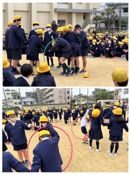 手をつないだまま輪をくぐらせようと、身体をくねらせていました。