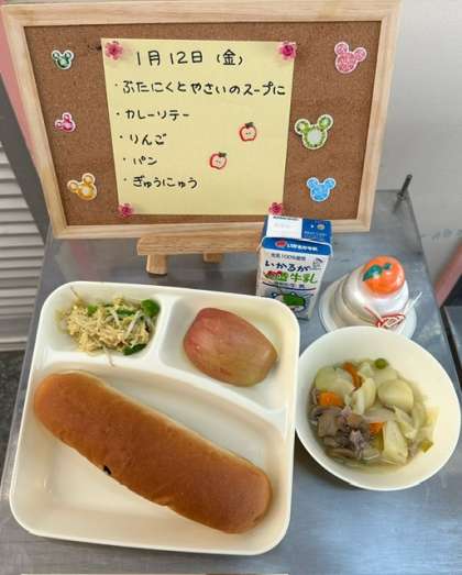 豚肉と野菜のスープ煮・カレーソテー・りんご・パン・牛乳