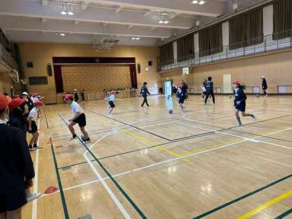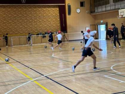 あいにくの雨天で、運動場の予定を講堂に変更してサッカーを楽しみました。