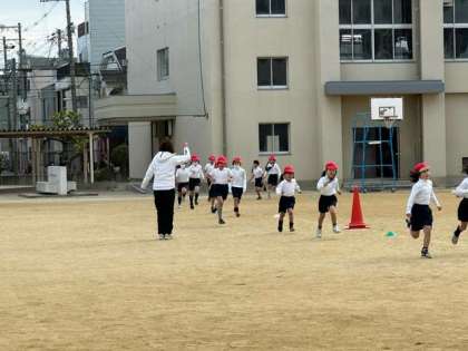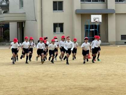 気温が低い中、かけ足で運動場を走っています。