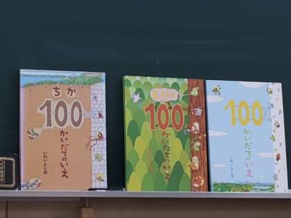 100かいだてのいえのシリーズを紹介していただき、今日は沼の絵本を読んでいただきました。沼の底に向かって100階までを、巻物のように長い紙で見せていただき、子どもたちも興味津々!!
