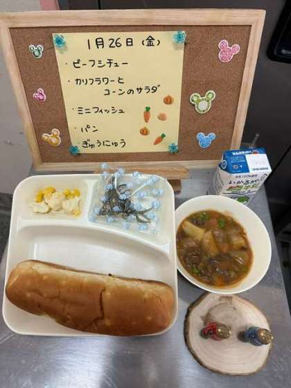 ビーフシチュー・カリフラワーとコーンのサラダ・ミニフィッシュ・パン・牛乳