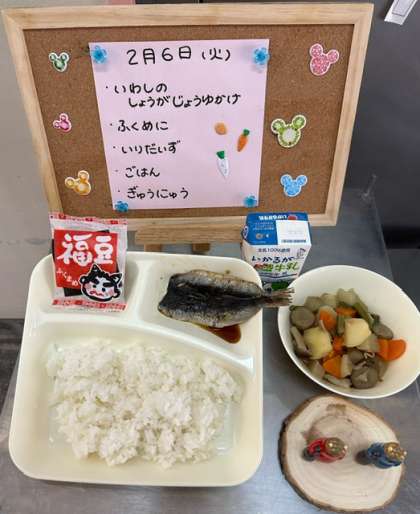 いわしのしょうが醬油かけ・ふくめ煮・煎り大豆・ごはん・牛乳