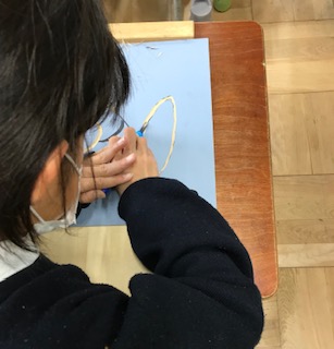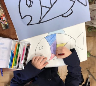 図画工作科で「もようのある魚」を制作しています。下描きをしたものをマジックペンでなぞり、その線を彫刻刀で彫っていきます。